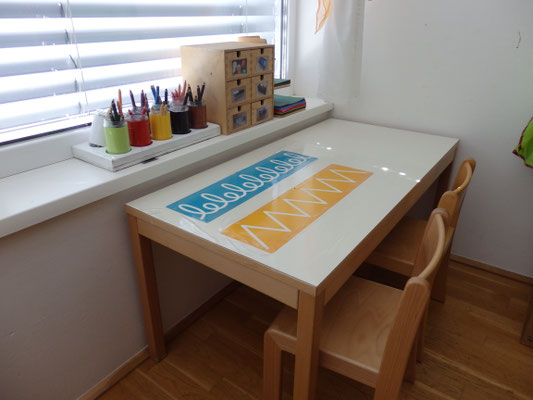 Der Tisch zum Basteln ist im täglichen Einsatz und die Kinder dürfen ihrer Kreativität und Fantasie entfalten.